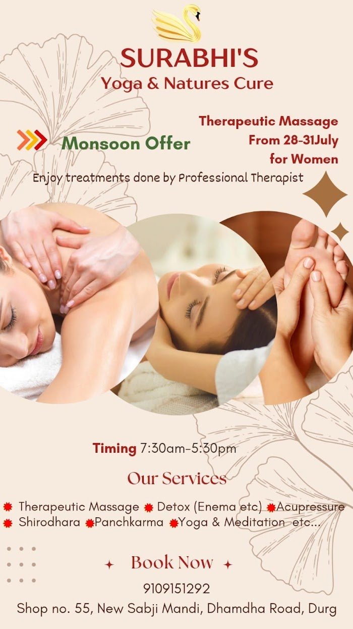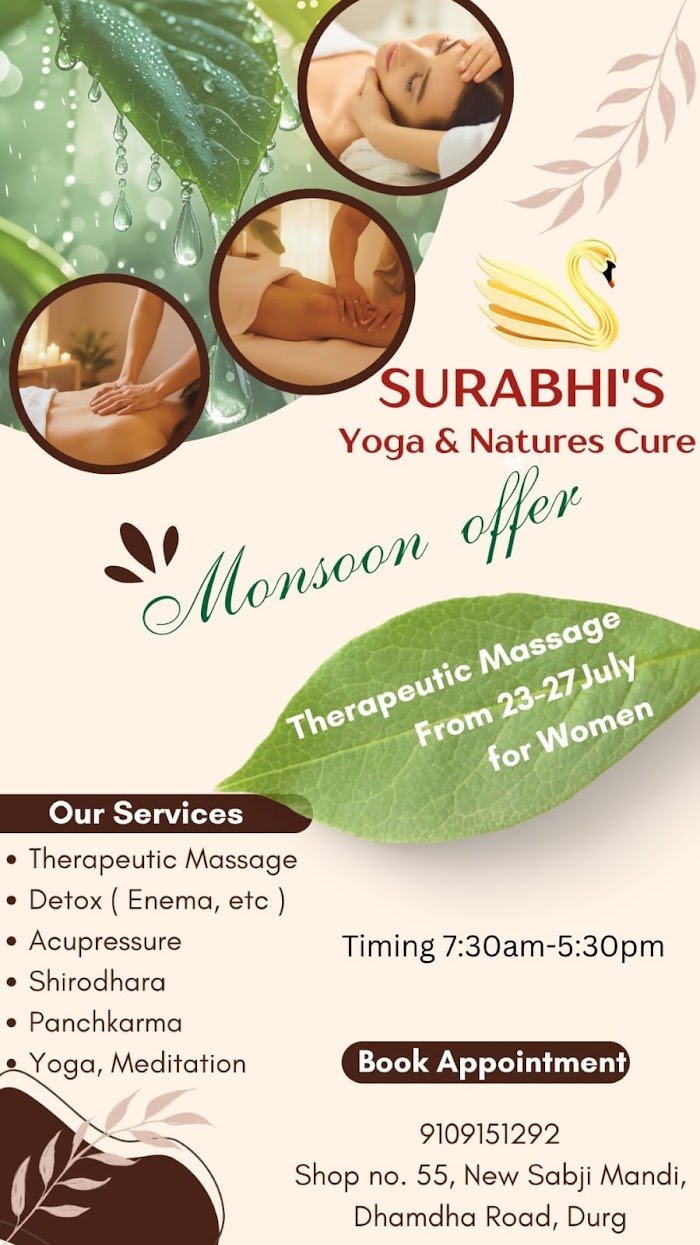Shop no 55, Krishi Upaj Mandi, Surabhi’s Yoga & Natures Cure, Durg – Dhamdha Rd, Sikola Basti, Durg, Bhilai, Chhattisgarh 491001, India